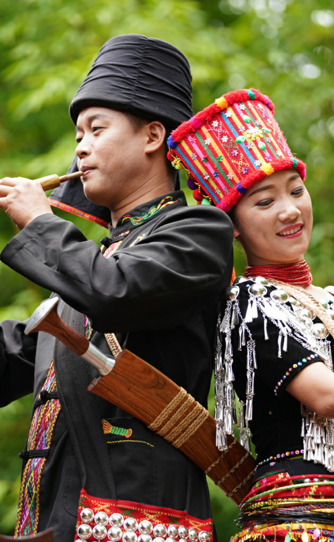 拉祜族人口約41萬,主要聚居在思茅、臨滄境內(nèi)的瀾滄江沿岸地區(qū)。拉祜族寨與基諾族寨緊緊毗連,寨內(nèi)建有拉祜族茅草房、大公房、教堂、牛棚以及葫蘆廣場。位于拉祜族寨中心位置的葫蘆廣場形似一只碩大的葫蘆平面,核心有一組石雕葫蘆。傳說拉祜族的祖先誕生于葫蘆中,因此葫蘆廣場表現(xiàn)了拉祜族的祖先崇拜觀念。漫步拉祜族寨,葫蘆笙悠揚(yáng)婉轉(zhuǎn)、口弦聲余音繞梁,表現(xiàn)拉祜族勞動場面的“豐收擺舞”充滿歡騰和激情,展示了拉祜族的民間...